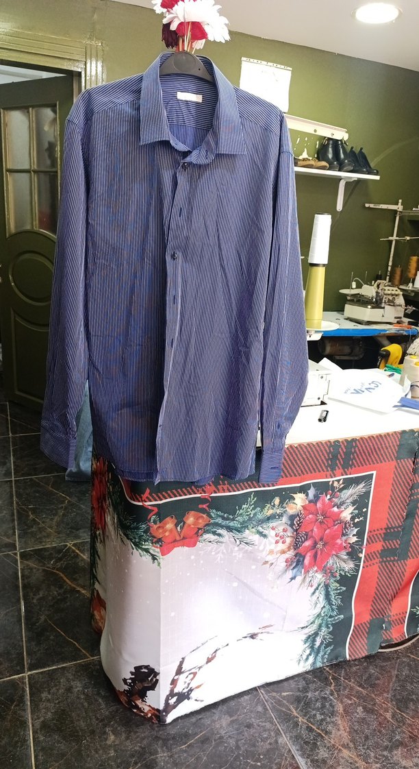 Düğmeli, notched lapel yaka ve uzun kollu lacivert erkek gömleği. Sentetik kumaştan üretilmiştir, günlük kullanım için uygundur.