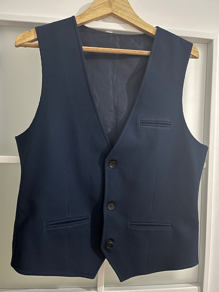 Düğmeli, lacivert erkek yelek, klasik kesim ve desen içermeyen tasarıma sahiptir. Ofis ve günlük kullanıma uygundur. Marka temsilidir