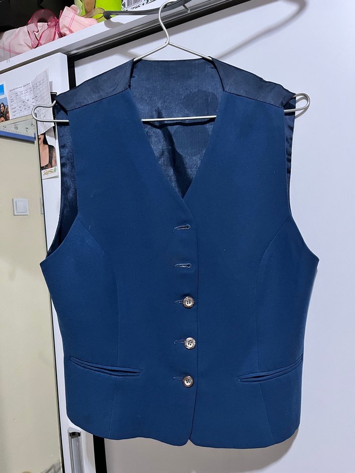 Düğmeli, kruvaze yaka, kolsuz lacivert yelek. Parlak sentetik kumaştan, normal boy ve regular kesim. Ofis ve sokak stili için uygun. ✨