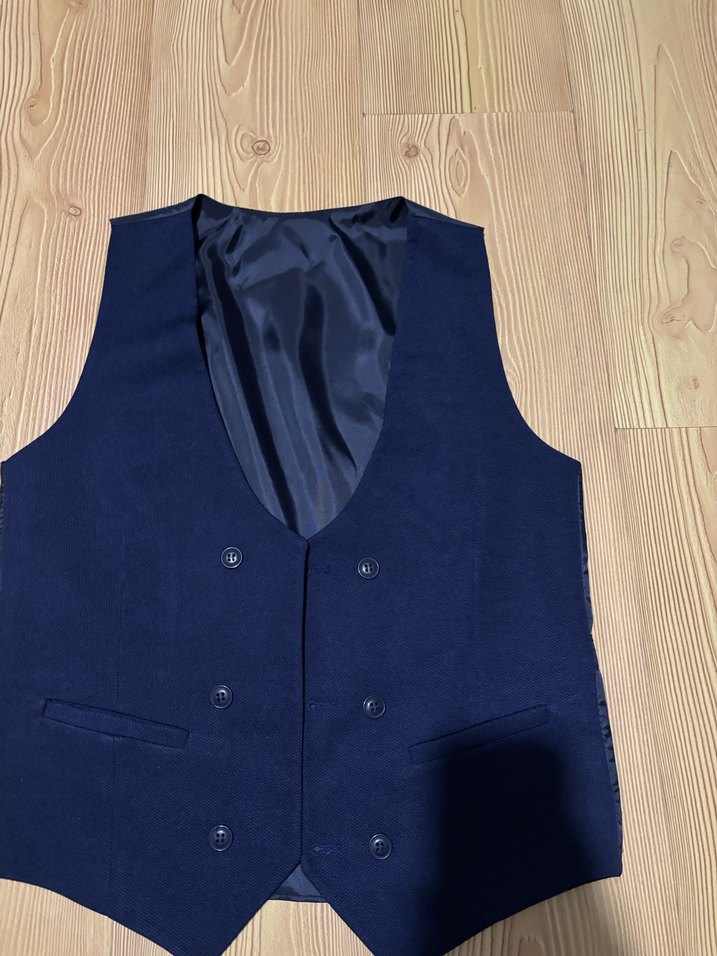 Düğmeli ön kısmı ve not detaylı yakasıyla, koyu lacivert renkte, sentetik kumaştan üretilmiş, regular fit kesim erkek yelek. Ofis kullanımı için uygundur.