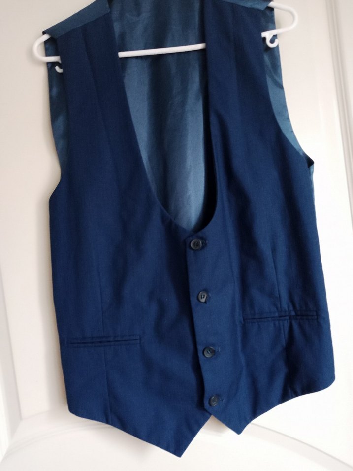 Düğmeli ön kısmı ve kırmalı yakası olan, lacivert renkte sentetik kumaştan üretilmiş erkek yeleği. Normal boy ve regular kesim, iş ortamına uygun.