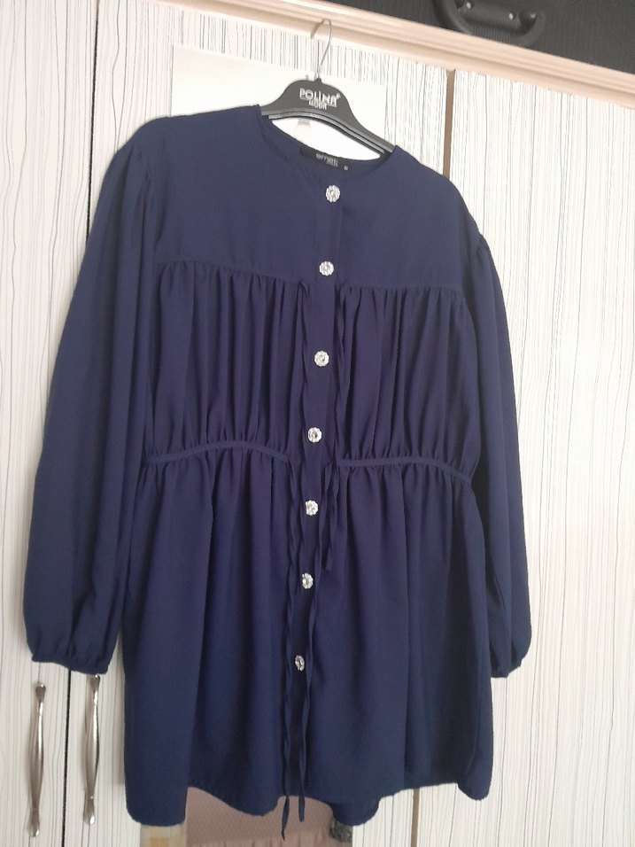 Lacivert renkte, uzun kollu, yuvarlak yaka ve düğmeli ön kısmı olan rahat midi boyda, günlük kullanıma uygun bohem tarzda.