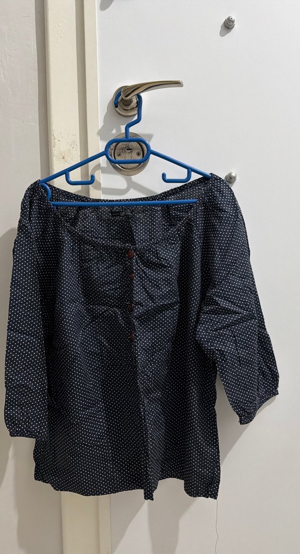 Pamuk kumaştan, düğmeli ön ve V yaka detaylı, uzun kollu, bol kesim lacivert hamile bluzu.