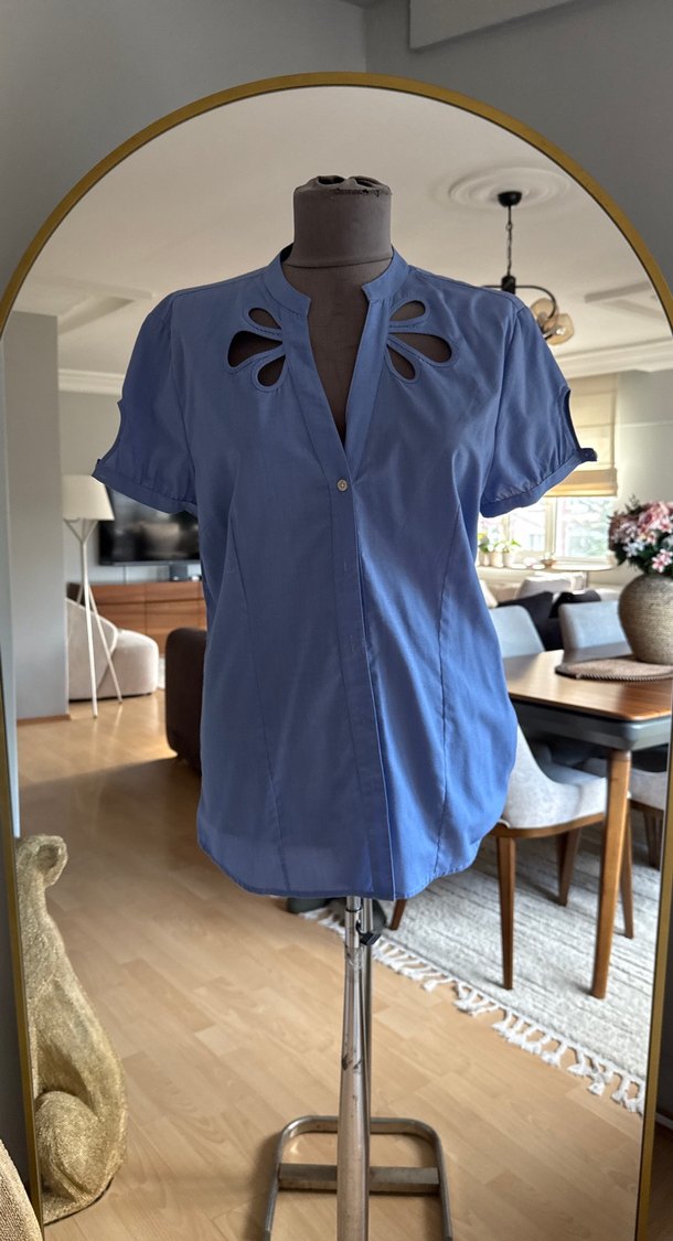 Lacivert denim hamile bluz, kısa kollu, V yaka ve düğmeli. Yakadaki kesik detaylarıyla salaş kesim, günlük kullanıma uygun.