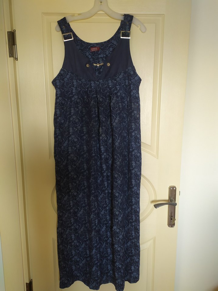 Düğmeli, askılı, lacivert hamile kot elbise. Salaş kesim, uzun boy ve koyu batik desenlidir. Günlük kullanıma uygundur.