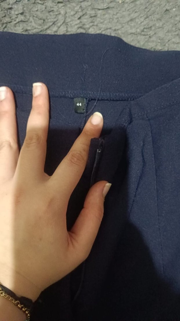 Düğmeli ön ve kesik yaka detaylı, sentetik kumaştan yapılmış, lacivert renkli, normal boy hamile pantolonu.