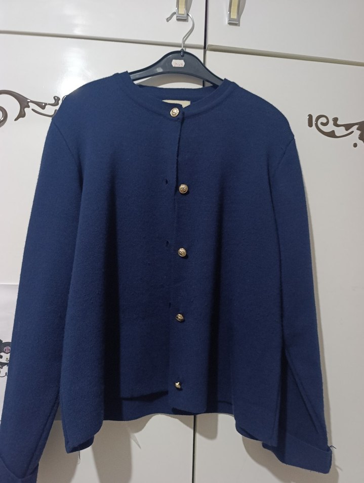 Düğmeli ön kısmı ve uzun kollu, lacivert triko s/m