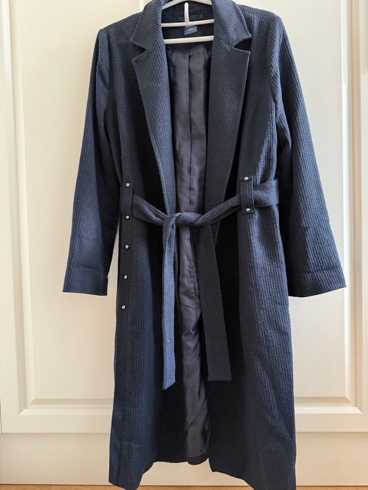 Düğmeli ve kemerli, kaşe kumaş ve astarlı lacivert uzun kaban. Beli kemerli Yargıcı marka 3 beden kuru temizleme yapılmış tertemiz hiçbir sıkıntısı yoktur
