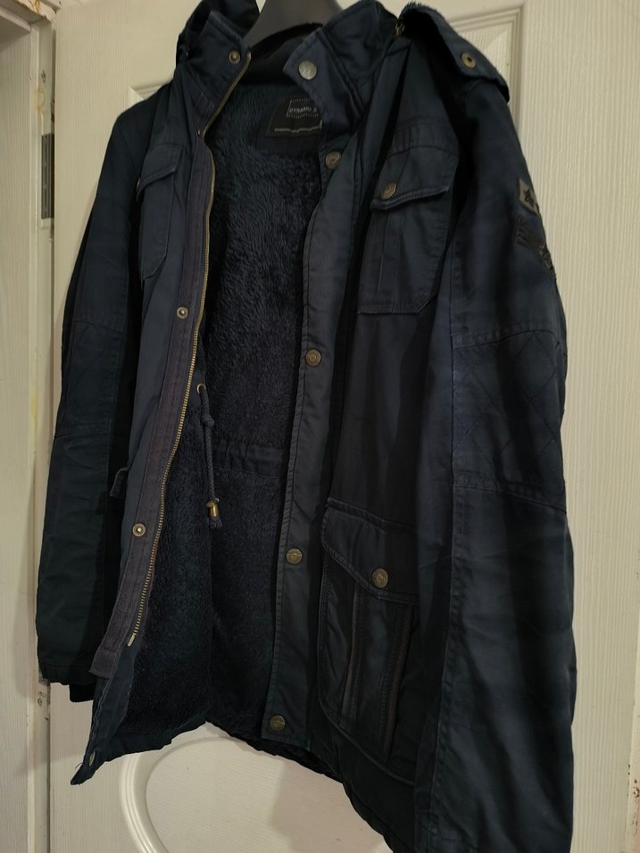 Lacivert kot kumaştan, düğmeli ve notched yakalı, bol kesim uzun kollu içi kürklü Rahat ve günlük kullanıma uygun.