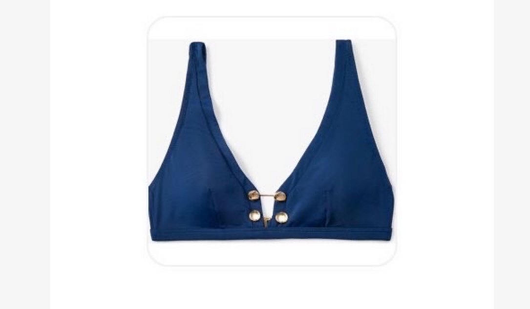 Düğmeli ve askılı, lacivert renkli, vücuda oturan kadın bikini üstü, etiketli