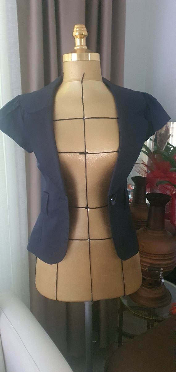 Düğmeli, lacivert kadın blazer ceket, yakası kesik ve askılı kollu, midi boyda, sentetik kumaştan yapılmıştır.