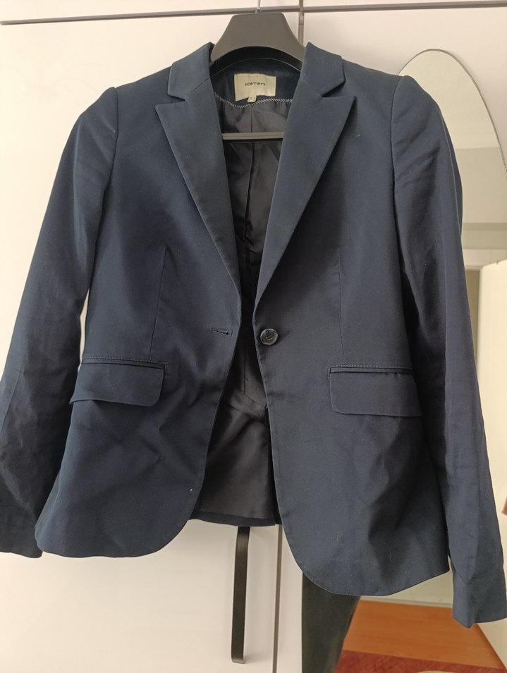 Düğmeli, yakalı, uzun kollu lacivert kadın blazer ceket. İpek gibi kumaştan, normal boyda ve rahat kesimdir. İş ve günlük kullanım için uygundur.