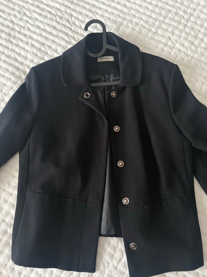 Düğmeli, yakalı lacivert kadın blazer. Uzun kollu, normal kesim ve ipeksi dokulu, ofis için uygun klasik tarzda bir ceket.