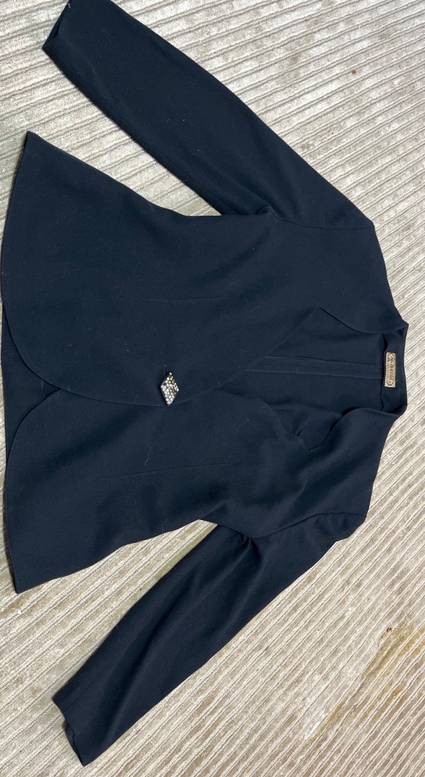 Düğmeli, kesik yaka, uzun kollu kadın blazer ceket. Normal boyda, sentetik kumaştan üretilmiş, lacivert renkte, ofis için uygun ve trend casual tarzda.
