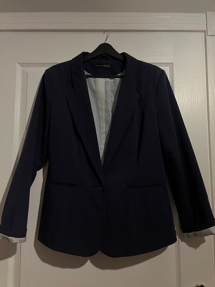 Düğmeli önü, uzun kollu ve kesik yakalı lacivert kadın blazer ceket. Normal kesim ve midi boyda, sentetik kumaştan üretilmiştir. Ofis ve günlük sokak stiline uygundur.