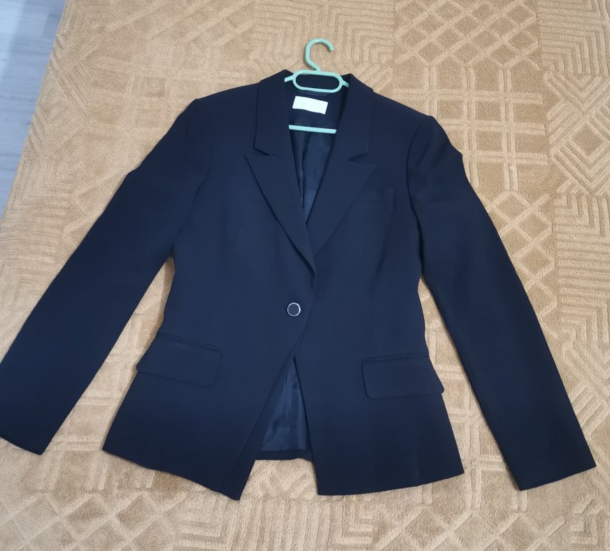 Düğmeli, kesik yaka, uzun kollu lacivert kadın blazer ceket. Normal kesim ve ipeksi dokulu kumaştan, iş ortamı için uygun klasik tarzda.