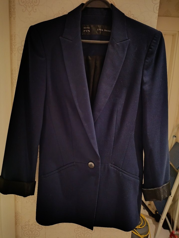 Zara Lacivert kadın blazer ceket, düğmeli ve notched lapel yakaya sahip. Uzun kollu, kol ağızları siyah satenimsi kumaştan, midi boy ve her ortam için ideal.