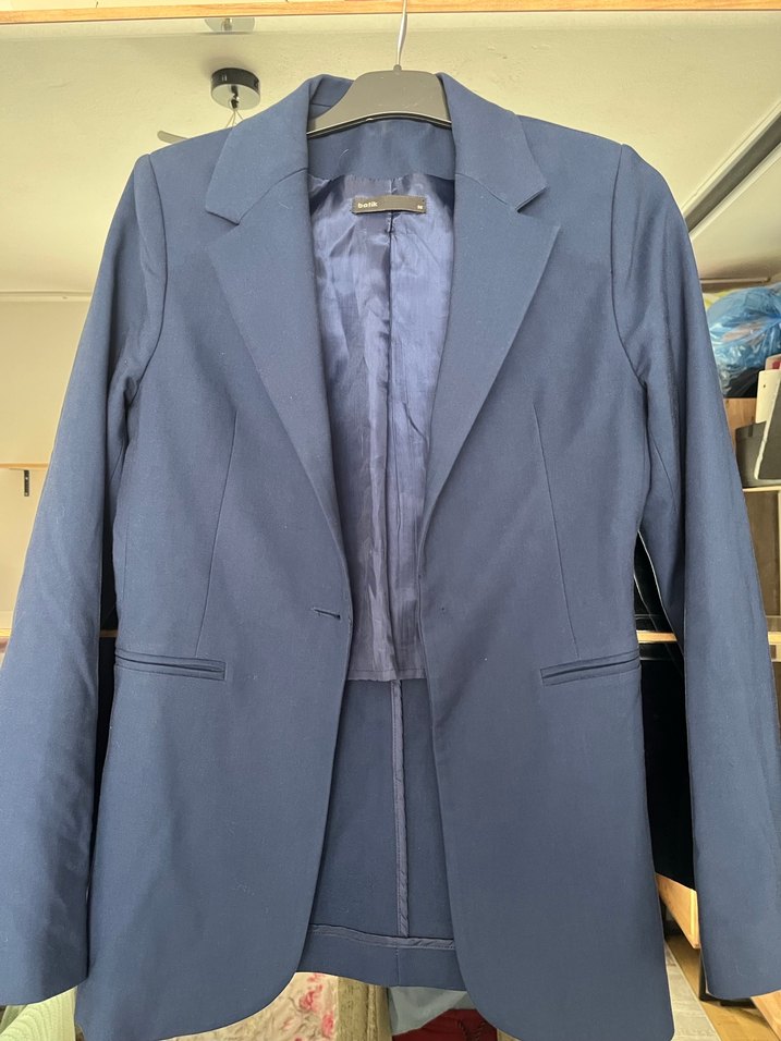 Lacivert kadın blazer ceket, kesik yakalı, uzun kollu ve düğmeli. Normal kesim ve ipeksi dokuda, ofis için uygun.