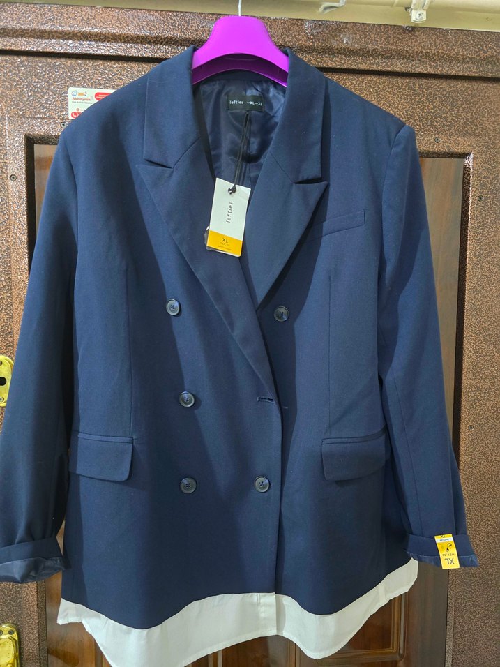 Lacivert renkte, düğmeli önü ve kesik yakası olan kadın blazer ceket. Uzun kollu, normal boyda ve sentetik kumaştan, ofis kullanımına uygun.sıfır ürün sadece 1 düğmesi eksiktir aldığımdada böyleydi bunu bilerek alım yapın lütfen, 1500e alındı kilo verdiğim için giyemedim ,markası lefties zaranın markası