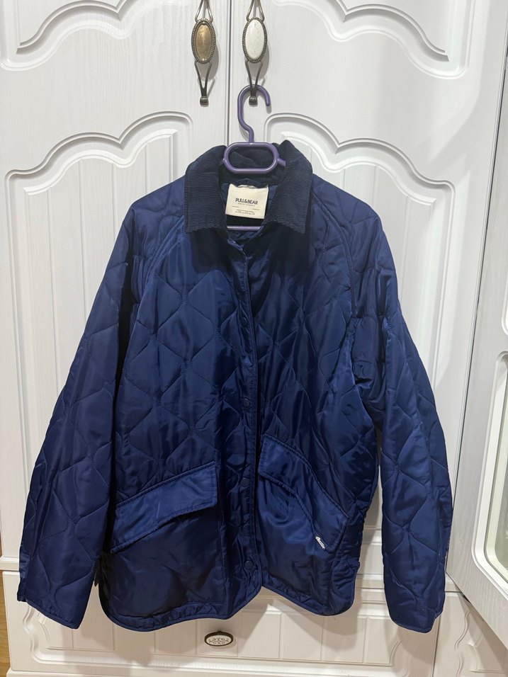 Lacivert renkli, uzun kollu ve düğmeli kadın ceket. Normal boyda, minimal tasarımlı, rahat kesimli ve sıcak tutan kumaştan yapılmıştır.