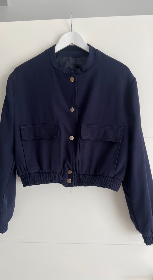 Lacivert kadın ceketin düğmeli önü, uzun kolları ve çıtmalı yakası vardır. Normal kesim ve midi boyda, yumuşak ve sıcak kumaştan üretilmiştir, günlük kullanım için uygundur.