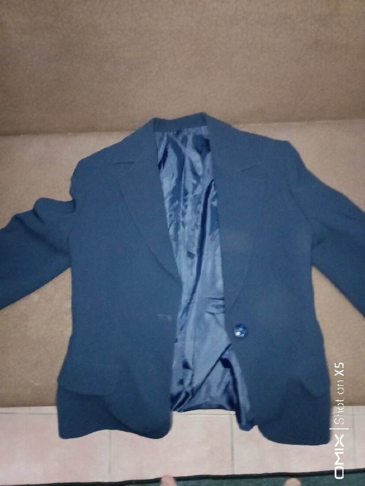 Düğmeli, klasik yakalı lacivert kadın ceket, uzun kollu ve sentetik kumaştan. Ofis ve günlük kullanıma uygun midi boy, regular fit.