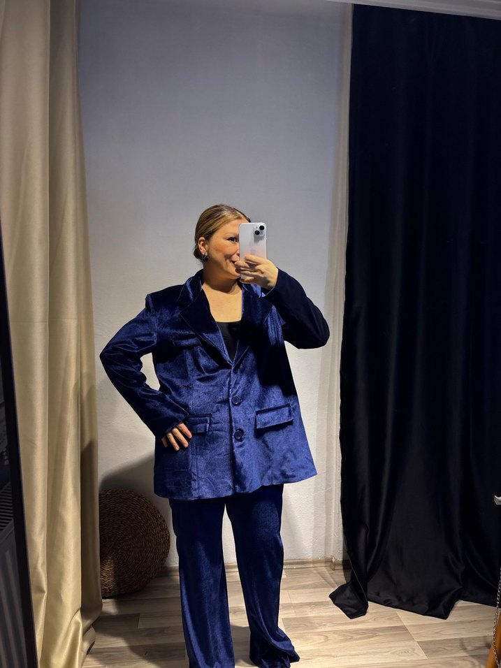 Düğmeli, koyu lacivert renkte, regular fit kesim ve uzun kollu denim blazer. Notch yaka ve midi boy, ofis kullanımı için uygun. L beden 80 95 uygundur