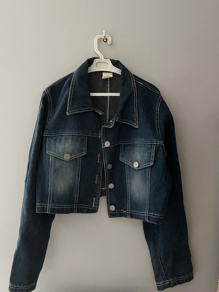 Düğmeli, notched lapel yaka ve uzun kollu, fitted kesim lacivert denim ceket. Günlük kullanıma uygun, casual ve streetwear tarzında.