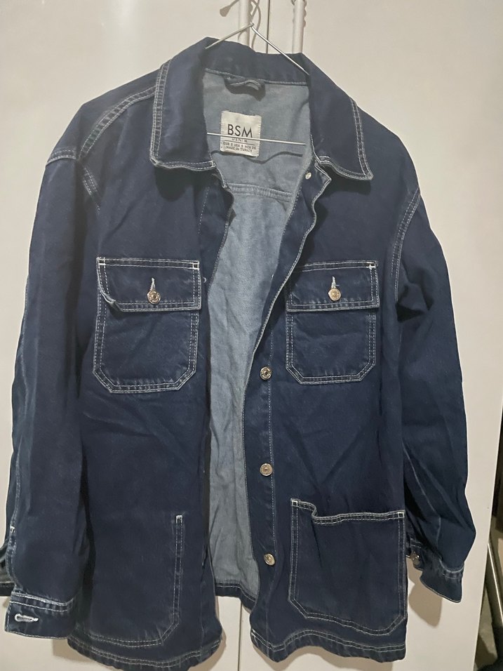 Düğmeli, cep detaylı lacivert kadın denim ceket. Notlu yakalı, uzun kollu ve bol kesim modeldir. Marka: BSM. Marka temsilidir