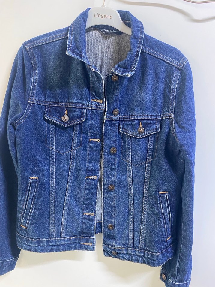 Düğmeli, lacivert denim ceket, kesik yaka ve uzun kolludur. Rahat kesimi ve normal boyuyla günlük sokak stiline uygundur.