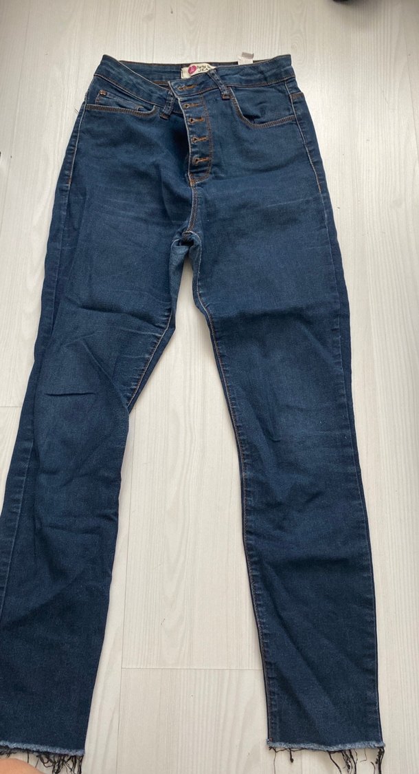 Düğmeli ön kısmı ve normal midi boyu ile lacivert, dar kesim kadın denim pantolon. Günlük rahat ve trend normcore tarz için uygundur.