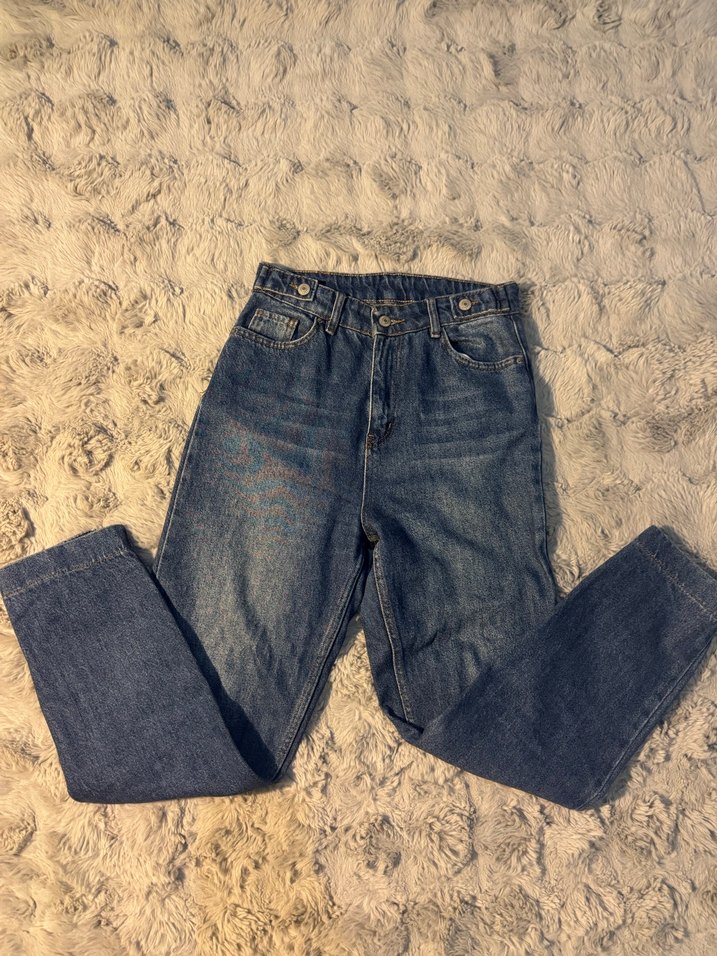 Düğmeli, bol kesim lacivert kadın denim pantolon, günlük rahat kullanım için ideal, normal boyda.