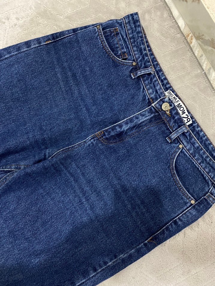 Düğmeli, parlak lacivert renkli denim pantolon. Normal boy midi kesim ve rahat regular fit ile günlük kullanıma uygundur.