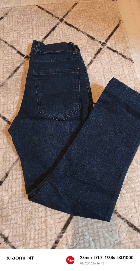 Düğmeli, lacivert renkte, regular fit kesime sahip kadın denim pantolon. Midi boy ve günlük kullanım için uygun.