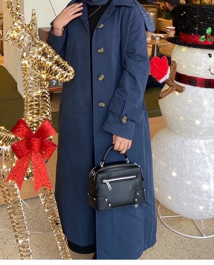 Düğmeli önü ve kayışlı kolları olan uzun lacivert deri trençkot. Notlu yaka ve rahat kesim, gündelik sokak stili için uygundur.