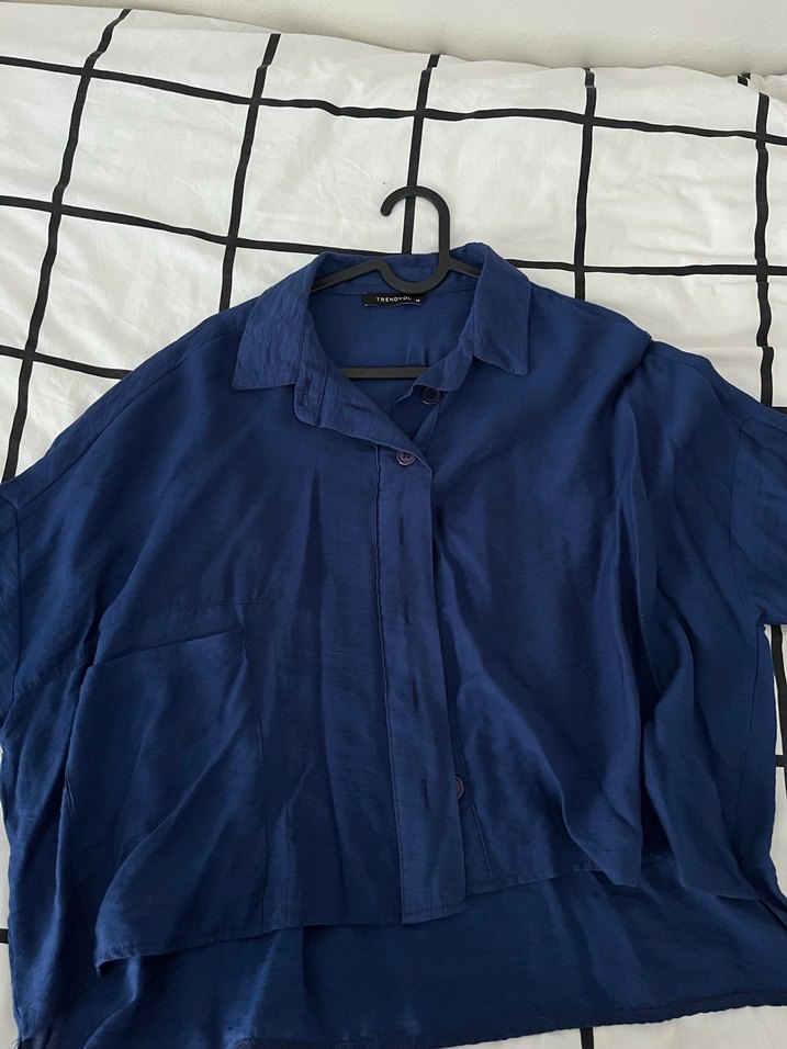 bol kesim lacivert kadın gömleği. Önü arkasına göre biraz daha kısa, minimalist ve desensiz tasarıma sahip, günlük kullanıma uygun.