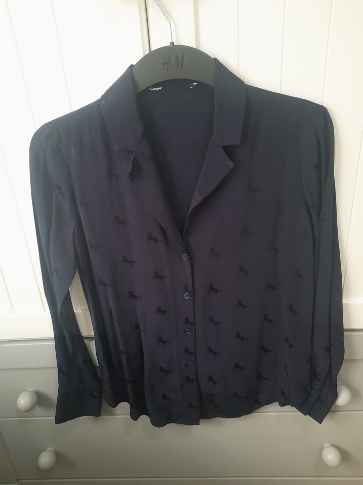 Düğmeli, uzun kollu, yakalı ve bol kesim lacivert kadın gömleği. İpek gibi kumaştan yapılmıştır, iş ortamı için uygundur.