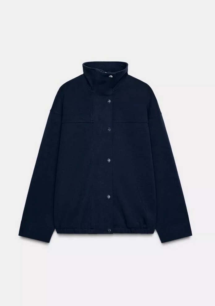 Uzun kollu, yüksek yakalı ve düğmeli lacivert kadın ceket. Rahat kesimi ve yumuşak, sıcak kumaşıyla günlük kullanıma uygundur.