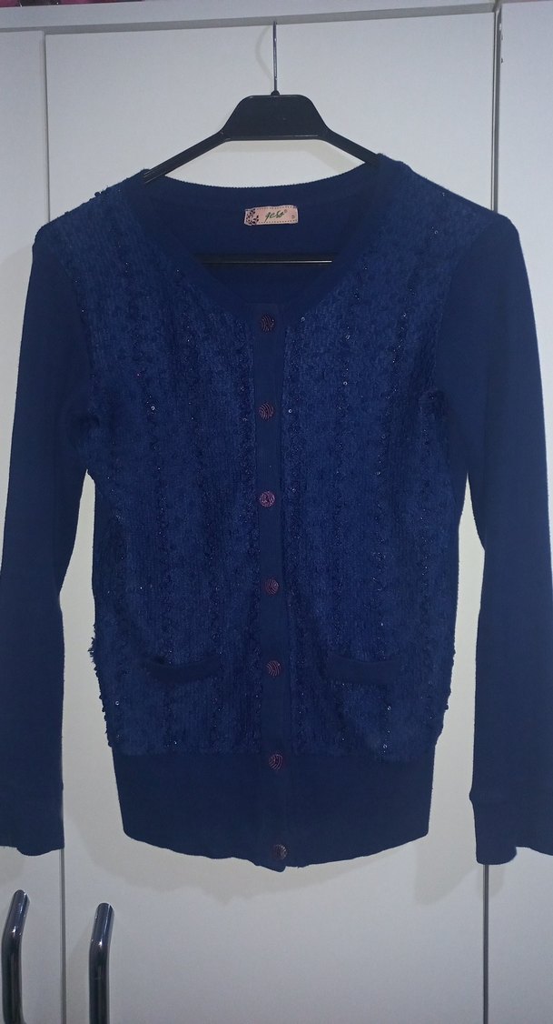 Düğmeli, uzun kollu, lacivert örme kumaştan, normal midi boyda ve ince kesimli kadın hırka. Günlük kullanıma uygundur.