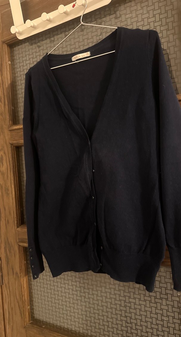 Düğmeli, lacivert renkli kadın hırka. V yaka, uzun kollu, bol kesim ve normal midi boyda. Pürüzsüz sentetik kumaştan, günlük kullanıma uygun.