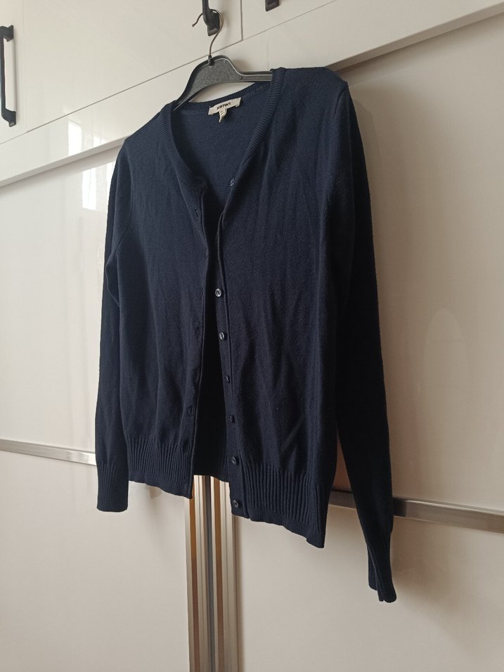 Düğmeli, lacivert triko hırka, uzun kollu ve midi boydadır. Günlük kullanım için minimalist tarzda rahat bir seçenektir. mevsimlik
