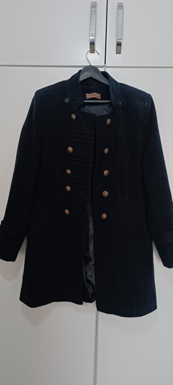 Yumuşak ve sıcak kumaştan, çift sıra düğmeli, yüksek yakalı kadın kabanı. Soğuk havalar için uygundur.