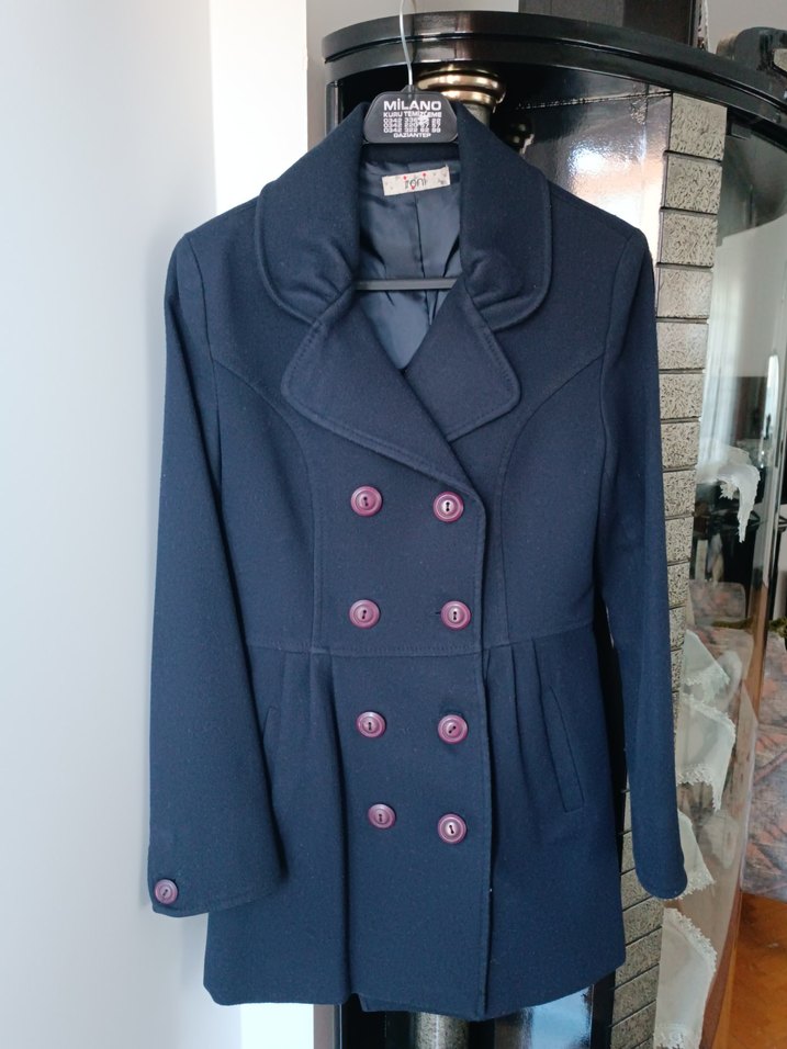Düğmeli çift sıra düğmeli ve yan cepli lacivert kadın kaban.