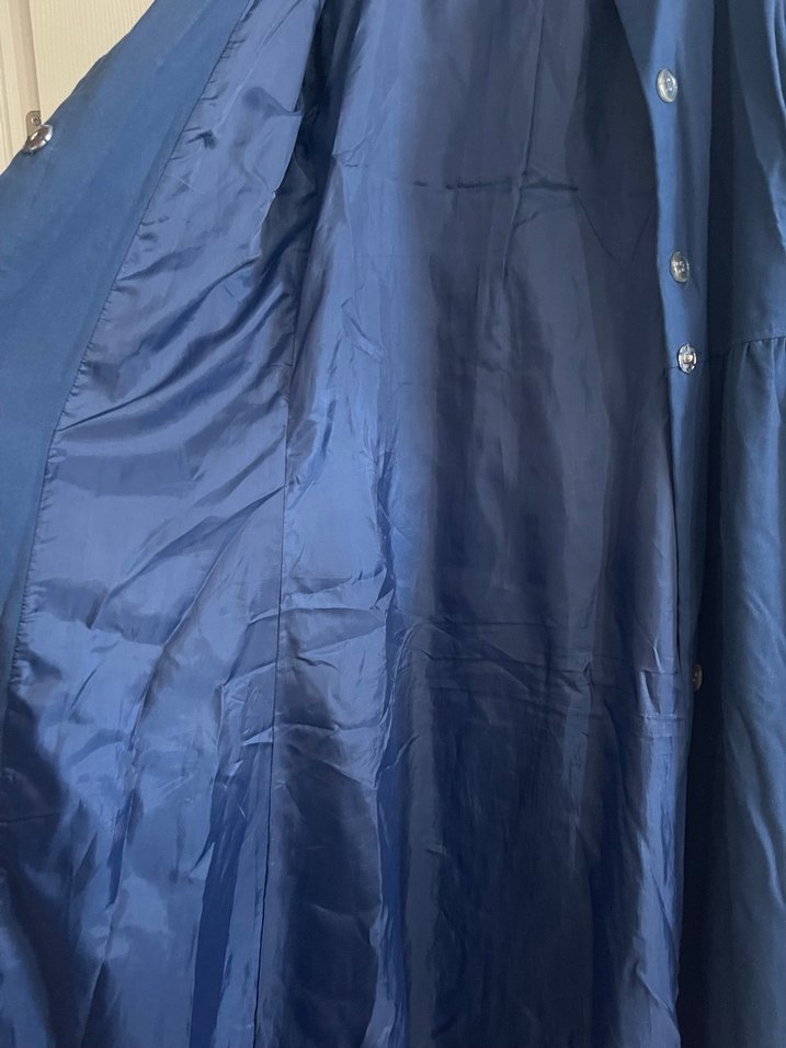 Düğmeli, parlak lacivert renkte, sentetik kumaştan uzun kollu kadın kaban. Normal kesim ve kesik yakalı, günlük kullanıma uygun bohem tarzda.