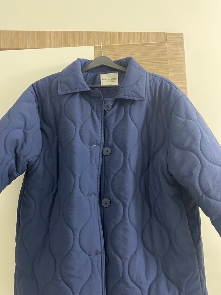 Lacivert renkte, midi boy kadın keten ceket. Düğmeli ve kesik yaka detaylıdır. Bol kesim ve uzun kolludur, sade ve rahat bir stil sunar. Günlük kullanım için uygundur.