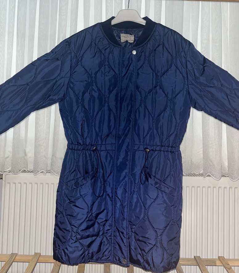 Düğmeli, uzun kollu, lacivert kadın kışlık mont. Suni kumaştan yapılmış, beli ayarlanabilir, normal boyda, rahat ve şık bir model.