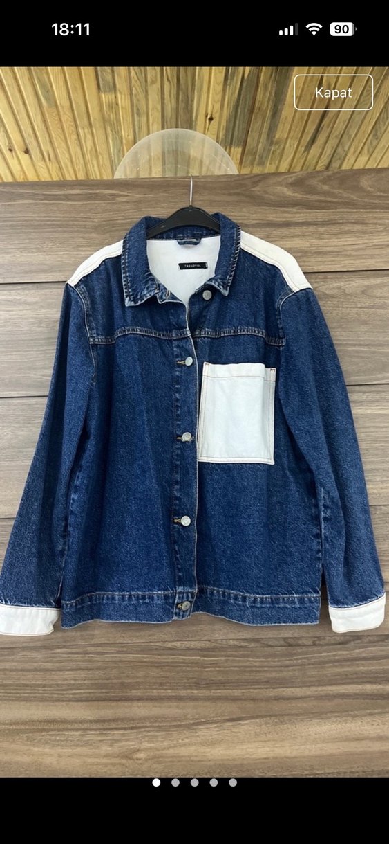 Düğmeli, uzun kollu ve normal boy lacivert kot ceket. Beyaz cep ve omuz detaylarıyla rahat ve şık bir günlük tarz sunar.