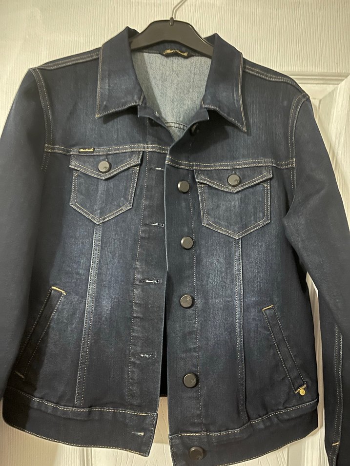 Düğmeli, yakalı ve fitted kesimli lacivert kot ceket. Uzun kollu ve günlük kullanıma uygun normal boyda.