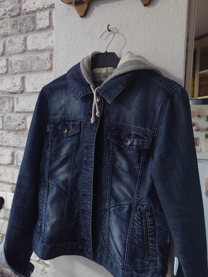 Lacivert renkli, düğmeli, notlu yakalı, uzun kollu, bol kesim kadın kot ceketi. Gri kapüşonlu, günlük kullanıma uygun rahat tarzda. Fiyat konusunda yardımcı olurum