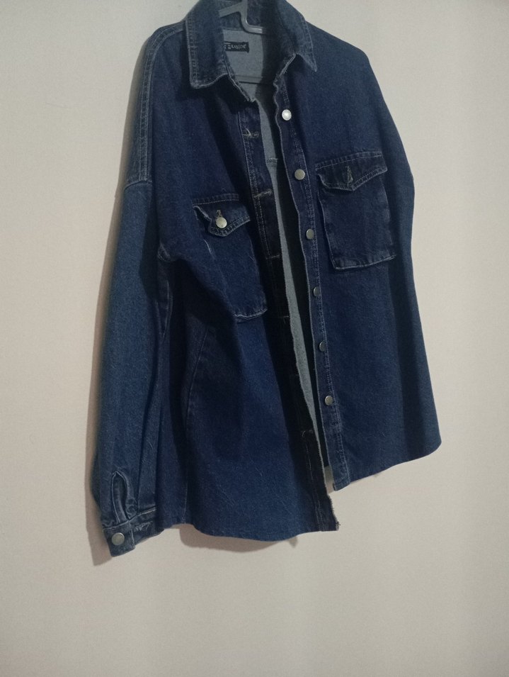 Bu kadın kot ceket koyu mavi renkte, düğmeli ön ve uzun kolludur. Gevşek kesim, yakası çıtçıtlı ve normal boyda olup günlük rahat sokak stili için uygundur. Desensiz tasarıma sahiptir.